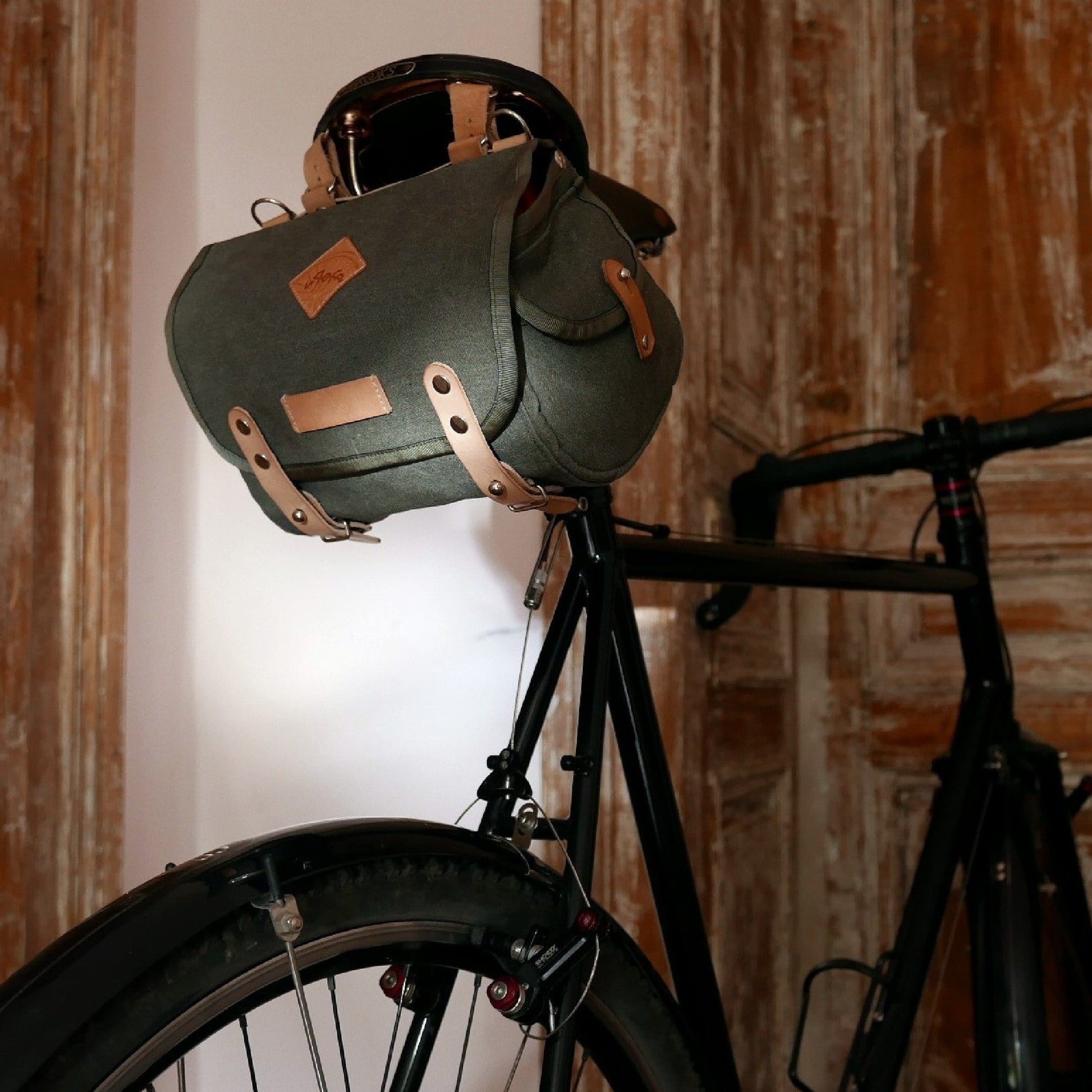 Tested on Tomo's cycle trips stood well the test of all conditions and was super handy in visited cities used as a photo / shoulder bag. Same as all other bags in the collection, Gooralka also can be attached to the handlebar, saddle or carried over the shoulder (strap provided).The bag should age gracefully as it's made of water resistant cotton duck with leather detailing.
